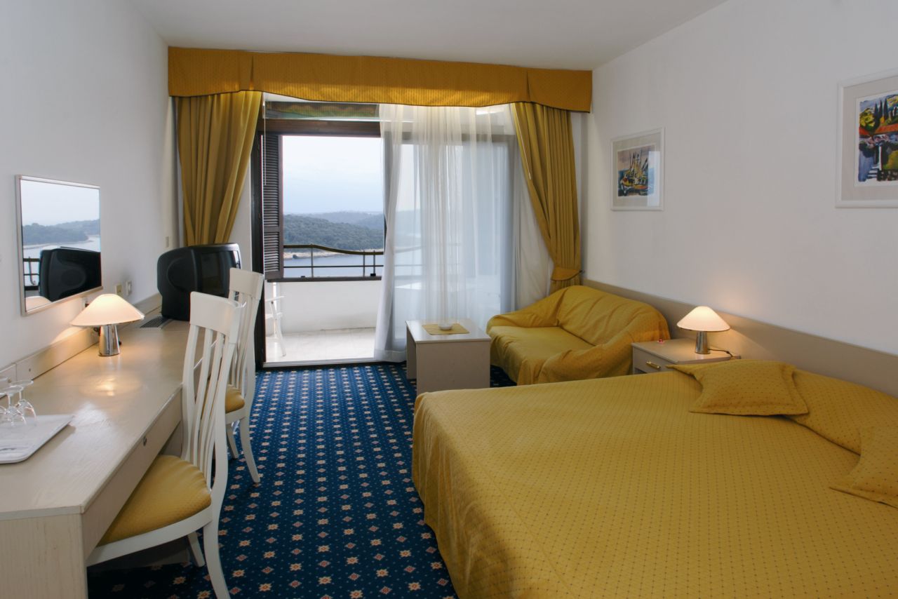 L’hotel dispone di 233 camere e 9 suite disposte su 3 piani, tutte con balconi panoramici, dotate di TV satellitare, aria condizionata, telefono, asciugacapelli, mini-bar e connessione all’internet Wi-Fi. Le dimensioni delle camere variano da 21 m2 per una camera singola fino a 46 m2 nelle suite dell’Histria che sono divise in una camera da letto e salotti; la capacità di una suite è 4 persone.