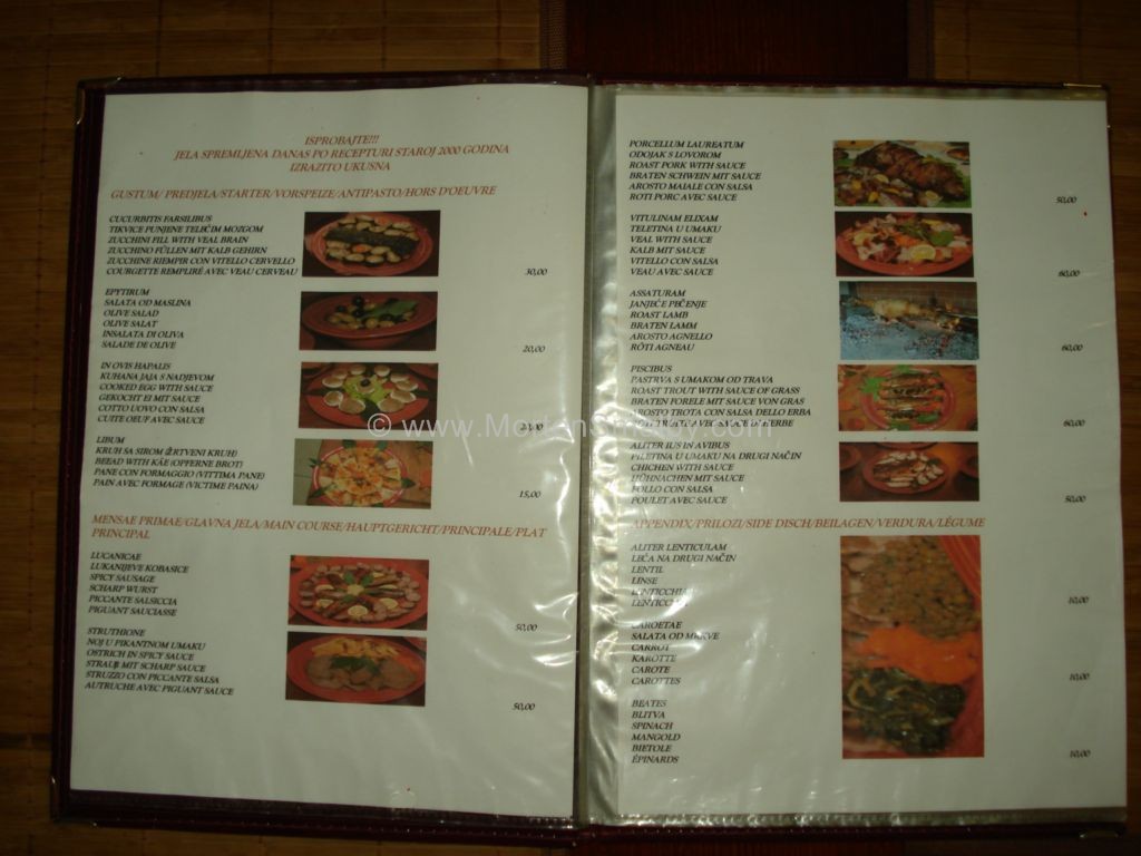 Quanto al cibo, questo ristorante è davvero speciale, non è come gli altri ristoranti che ho visitato in Croazia. Nel menu, tra l’altro, si può trovare una lunga lista dei cibi basati sulle ricette dell’Impero Romano. Alcuni esempi di cibi: